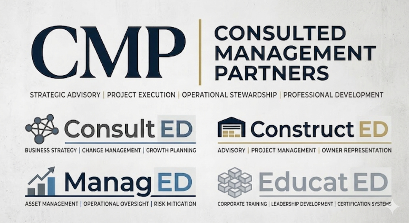 Consulted Management Partners (CMP) is a multi-disciplinary parent firm that governs a specialized family of companies: ConsultED, ConstructED, ManagED, and EducatED. Our mission is to provide an institutional-grade framework for the entire business lifecycle—from the first strategic spark to the long-term stewardship of physical and human assets.